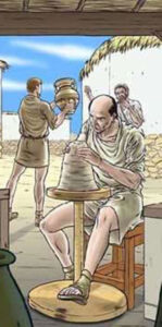 De vuelta al Mediterráneo, en el segundo milenio antes de Jesucristo. Seguramente tenemos a la vista una máquina muy simple para tratar la arcilla: se trata de una rueda de madera accionada por un pedal, la cual permite obtener vasos de forma perfecta, de superficie lisa y de espesor uniforme, en un tiempo relativamente corto.