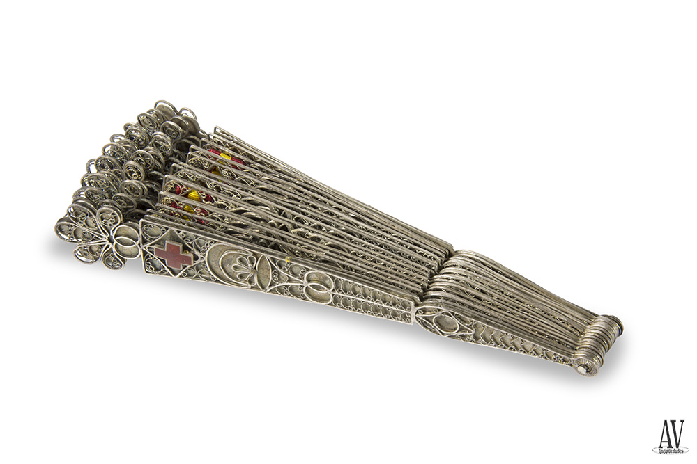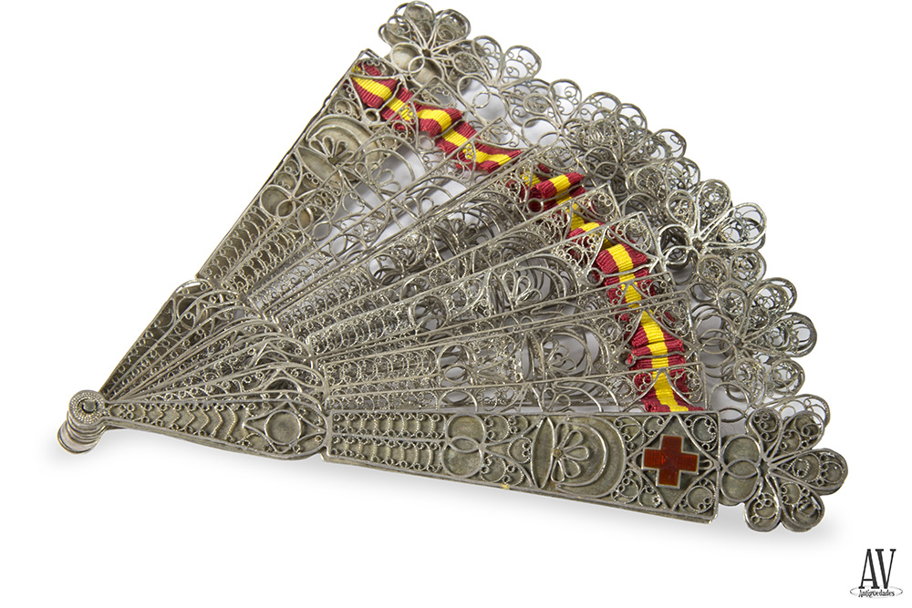 Abanico plegable con varillas de plata calada de filigrana y cinta entrelazada con la bandera española, país en plata con diferentes motivos decorativos y ribete de flor de cinco pétalos también de plata, dos guardas, padrón con insignia de cruz con esmalte rojo, perteneciente a la orden de las cruzadas españolas, y misma decoración. Buen estado.