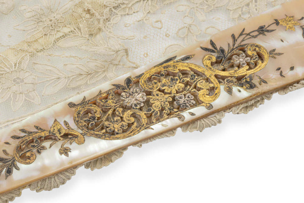 Gran Abanico antiguo, pericones. País de encaje de Bruselas con delicada decoración de flores, hojas y orlas sobre base de tul: rematado en formas ondulantes siguiendo los diferentes motivos. Montura de madre perla o nácar calado haciendo motivos de flores y rocallas, con incrustaciones de panes de plata y oro. Siglo XIX