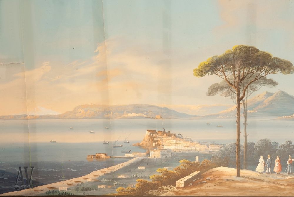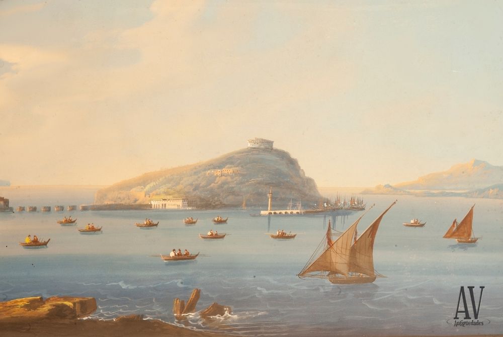 Pareja de Gouache napolitano de gran tamaño: vista del Islote de Misot0 y Golfo de Bogo están finamente ejecutado. Es de principios del siglo XIX. Representa la bahía de Nápoles con las diferentes islas y castillos al fondo. De color muy fresco, podemos ver barcos en el horizonte, campesinos y pescadores en primer plano, vegetación y toda la arquitectura de la ciudad. No está firmada. En cambio, lleva la marca Islote de Misoto y Golfo di Bogo escrito al gouache.