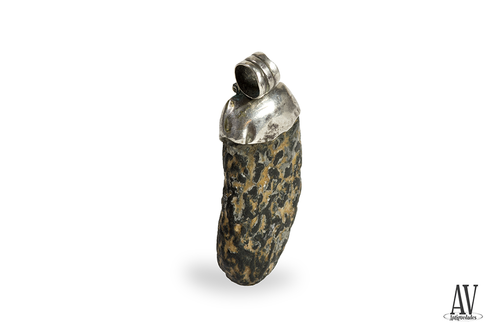 Piedra de meteorito en forma alargada. ovalada y plana, de color negro con irregularidades, engarzada en plata con anilla articulada para suspensión.