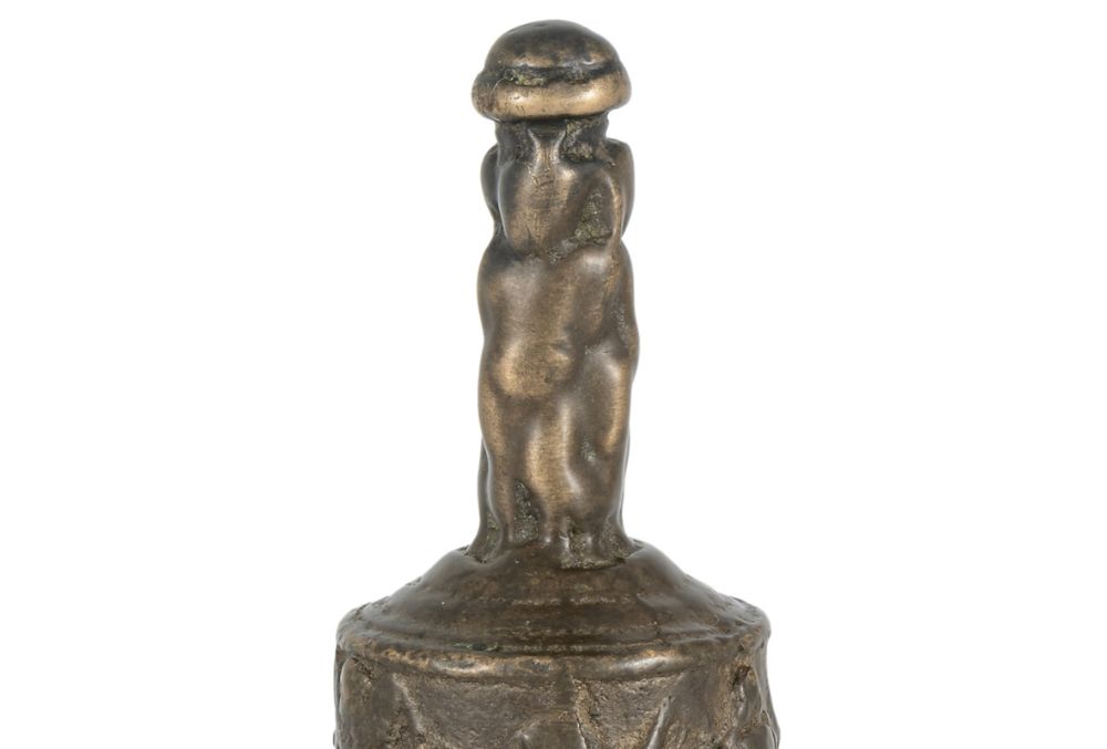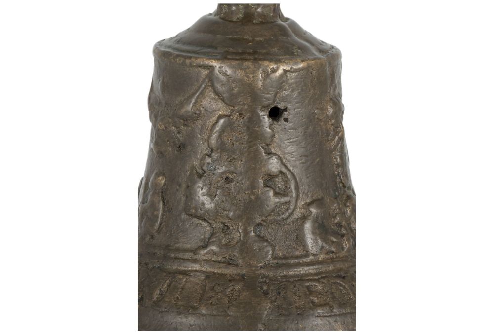 Campanilla de mano realizada en bronce de forma campaniforme, de uso eucarístico, con decoración al exterior en relieve, en el cuerpo presentando decoración plateresca del principios del Siglo XVI, ángeles músicos, guirnaldas, caras, animalitos.., base inscripción en latín, también en relieve, «Sit Nomen Domini Benedictum» (Bendito sea en nombre del Señor). Mano presenta, algo desgastada por el uso, tres niños contrapuestos con remate de bola. Interior badajo en hierro.