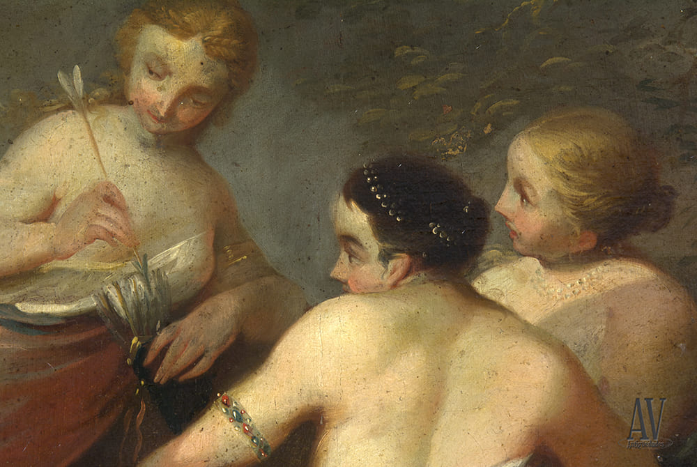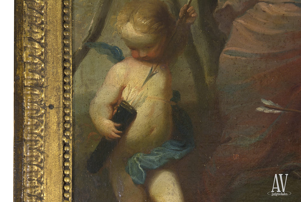Se representa a Cupido y las tres Gracias en un paisaje enmarcado por árboles a cada lado, composición centrada de las tres gracias formando un circulo, dando movimiento a la escena, al encontrarse cada figura en diferentes posiciones; túnicas cubriendo partes del cuerpo, dejando al descubierto la zona del pecho (normalmente se las representa de pie, desnudas con un paño al vuelo), cabello recogido, portan flecha con el carcaj y esenciero de perfumes; cupido, a un lado, como niño alado jugando con las fechas y el carcaj, atrae la atención de las Gracias giradas hacia él. El color homogéneo, destacando el contraste de las túnicas y paños con nuevos colores (dorado, blanco, azul, rojo anaranjado).