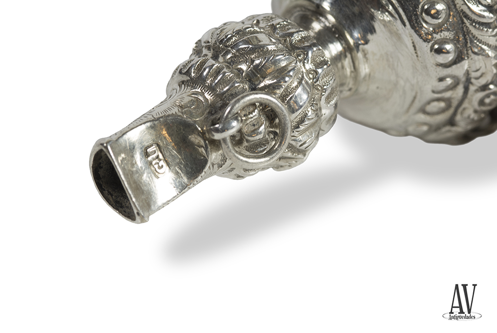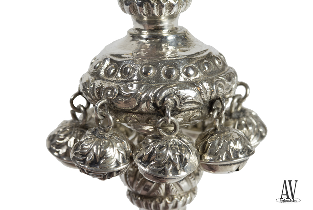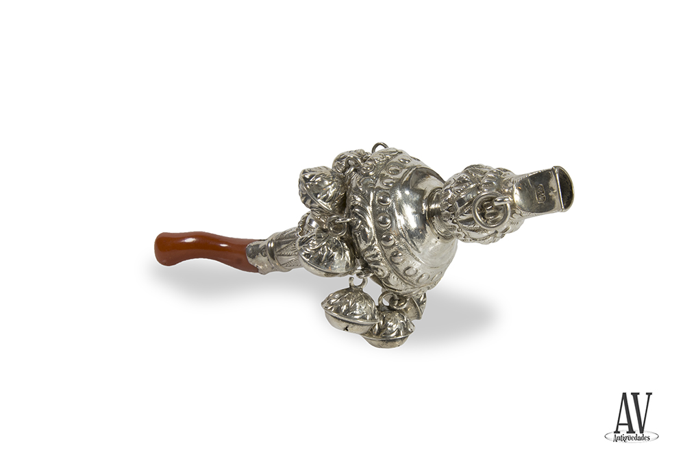 Sonajero de plata moldeada, grabada y cincelada. Marcas de Birmingham ( 1869-70) y platero George Unite. Siglo XIX . Cuerpo esférico que se alarga formando un cuerpo esférico de tres anillos del que sale un silbato, mango de forma cónica con cuerpo esférico igual al cuello, coral encajado que alarga el mango, cuerpo con ocho cascabeles suspendidos en cintura, decoración de formas geométricas.