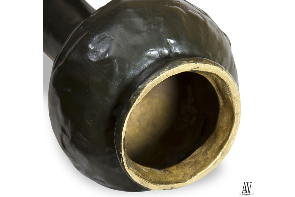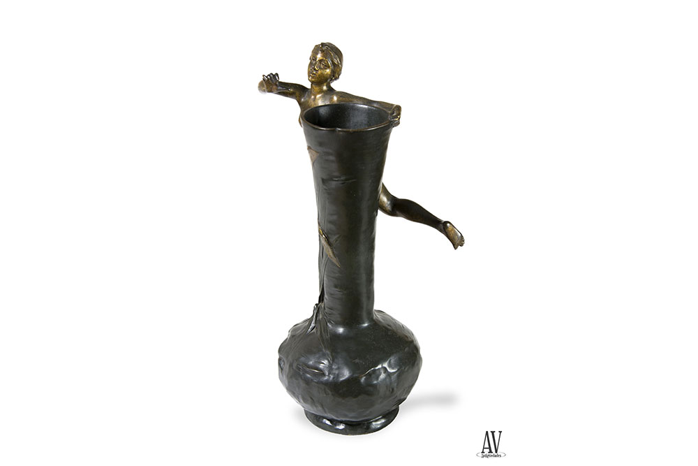 Bronce representando un jarrón con cuerpo esférico y cuello abocinado muy prolongado, con textura muy naturalista, cuerpo simula zona de agua del que salen plantas acuáticas; sobre él se apoya una figura femenina en equilibrio, en actitud danzante, que se sujeta al jarrón abrazando la boca y con la punta del pie, desnuda con velo que vuela sobre el jarrón, con mucho movimiento en contraste con la rectitud del jarrón. El autor utiliza dos tipos de pátina una dorada para la figura y otra más novedosa en tono verde oscuro. Su datación Modernista, finales del siglo XIX principios del XX, se hace atendiendo a sus características técnicas y artísticas. Firmado en la base Bofill.