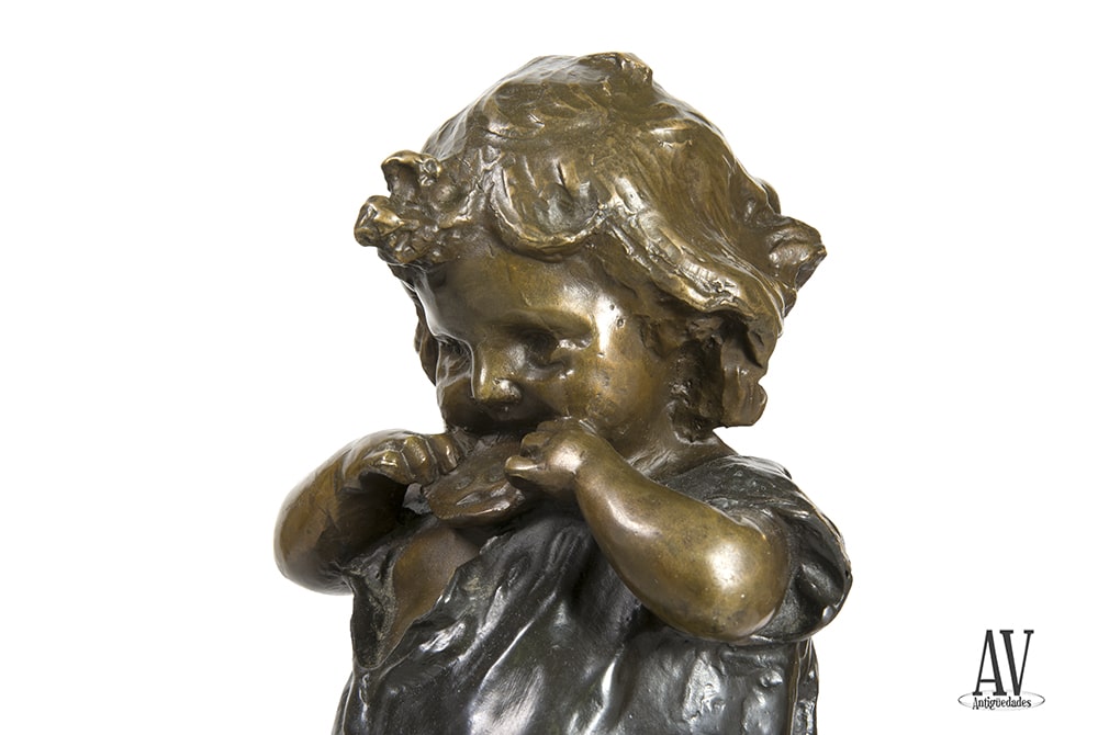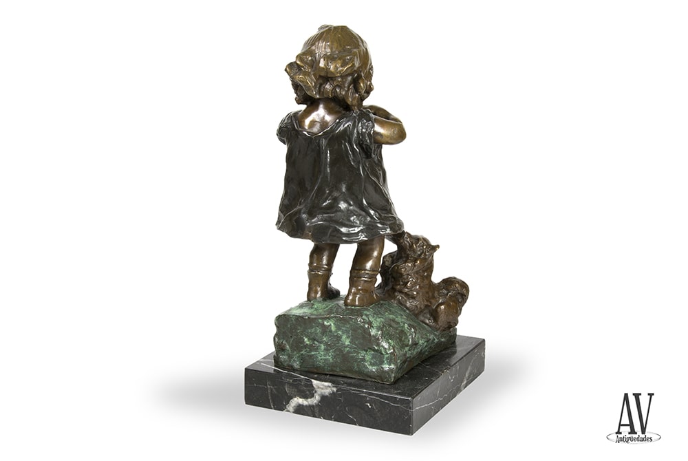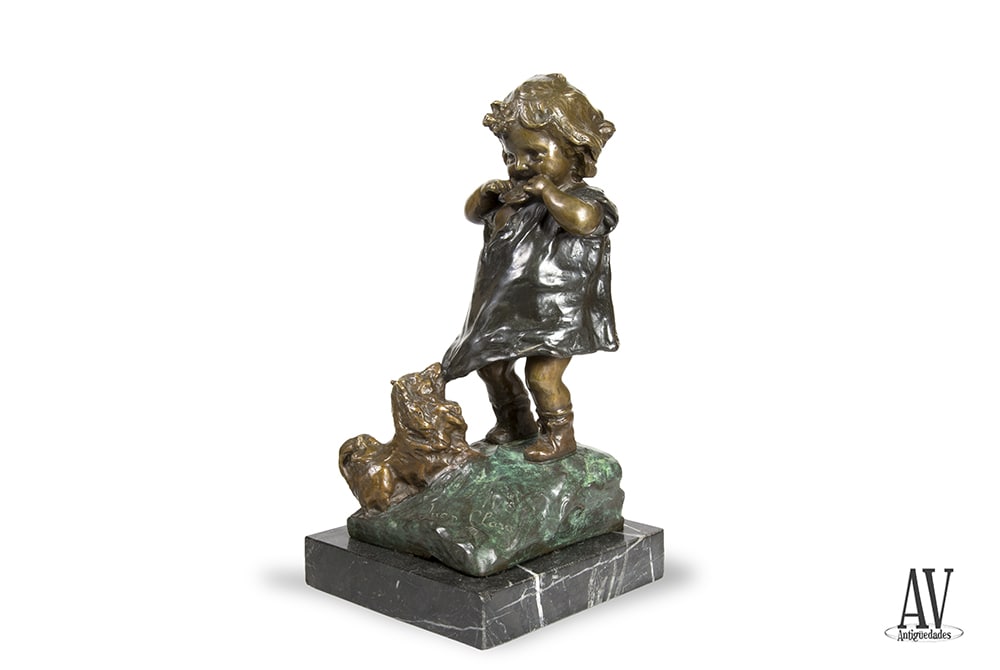 Escultura de temática infantil, representando a una niña mendiga comiendo una galleta con el perro tirando del vestido para que la comparta; realizada en bronce macizo, fundido y patinada en tres tonos, verde, marrón y negro; sobre base de mármol negro veteado.