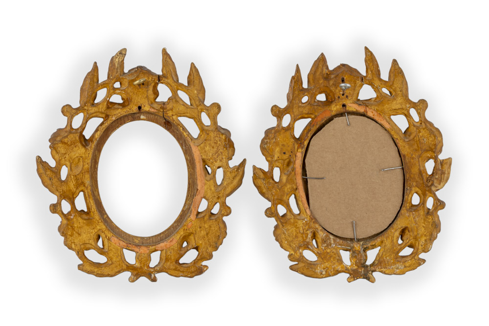 Pareja de Marcos en madera tallada y dorada, formato ovalado con talla a modo de laureas alternando hojas lanceoladas y flores. Imperio Español. PP. SIglo XIX.