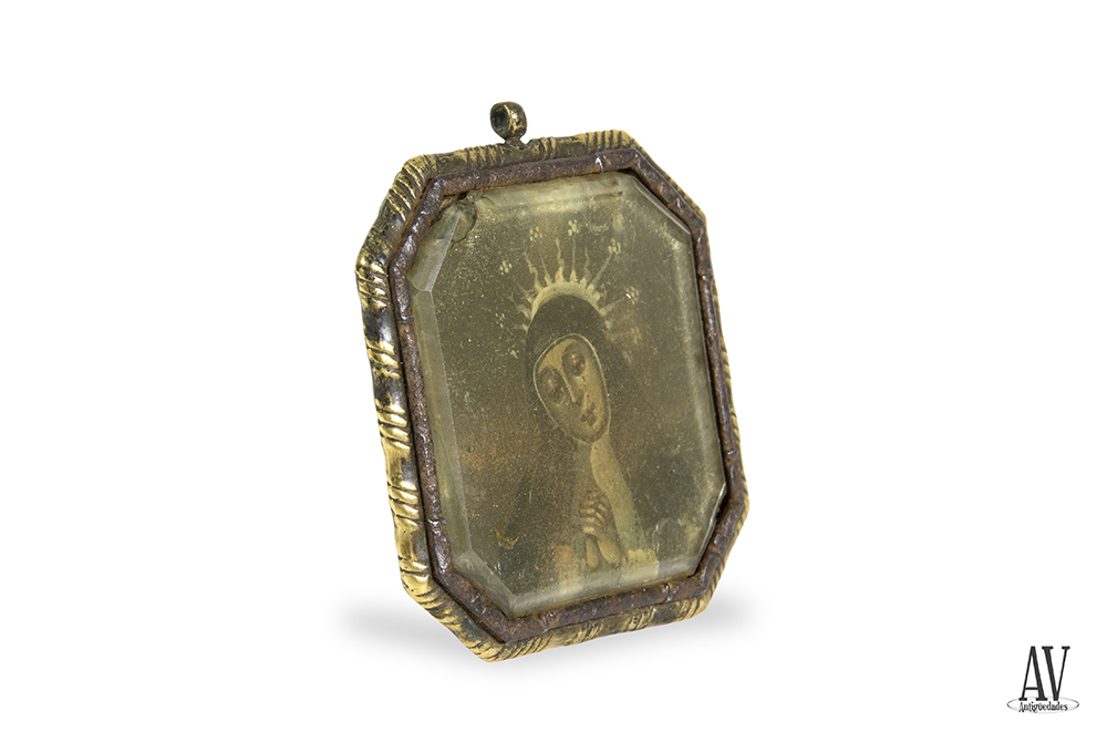 Medalla Devocional o Relicario con marco de hierro y bronce, forma cuadrada con las esquinas achaflanadas, para la realización del marco han utilizado el hierro como primer contorno y sobre él bronce, con decoraciones geométricas de rayados, cristales biselados en ambas caras; interior imagen pintada de la Virgen de la Paloma de medio cuerpo y en el reverso San Antonio de Padua con el niño y ramo de azucenas o lirios.