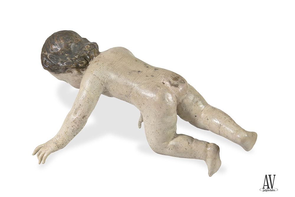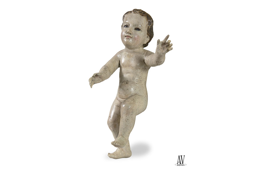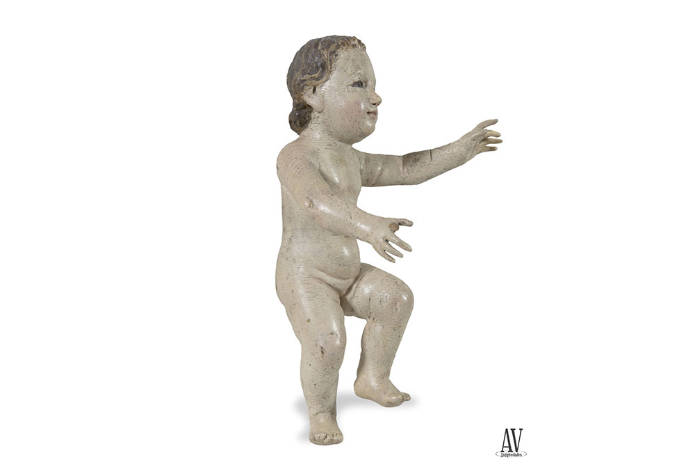 Escultura de bulto redondo tallada en madera, modelado anatómico simple, realista según corresponde a un niño, lo representa con movimiento, activo, comunicativo en aptitud de juego, manos largas con dedos separados; rostro dulce, idealizado, con ojos de cristal. El autor, anónimo, conoce el arte de la talla sin llegar a la maestría del profesor, considerando esta talla una obra de taller de época barroca. Policromía original, encarnaciones pálidas con toques sonrosados en cara. Siglo XVIII.