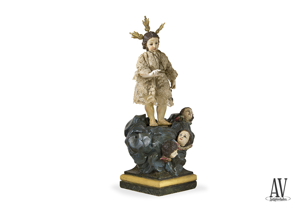 Talla de «Niño Jesús» sobre peana de angelitos, realizada en madera y hueso policromado, vestido con ropa de encaje y potencias de plata dorada. Tipo «Cap i Pota». Filipino, Siglo XVIII