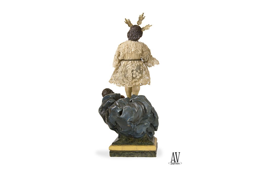 Esta pieza de Niño Jesús lleva articulados los brazos a la altura de los hombros y codos, realizado en dos materiales cabeza y brazos desde el codo en marfil, resto del cuerpo en madera policromada; tronco tallado con menos detalle y la zona de sus partes pintado en azul. Vestido de mangas, realizado en encaje de ajuga, blanco con flores y hojas, recogido a la cintura y cuello con cordón de oro, tres resplandores en plata dorada. Apoya sobre peana de nubes talladas con tres angelitos alados con cabezas de marfil policromado.