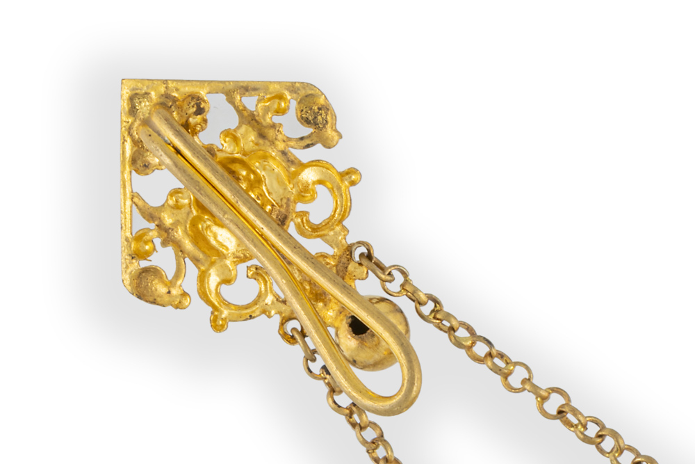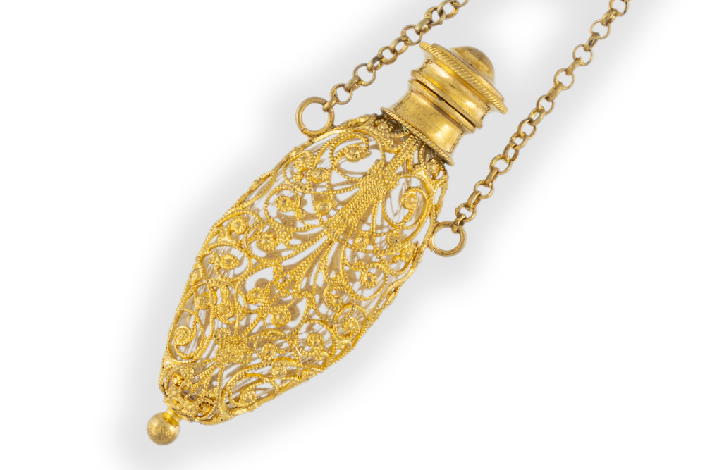 Perfumero para llevar colgado del cinturón de cristal transparente, latón dorado «ormolú» fundido, calado y esgrafiado. Forma ovalada cubierto, a modo de funda, de latón simulando filigrana haciendo una composición a base de roleos, cuello cilíndrico, tapa de cúpula que cierra a presión, tapón interior de cristal. La horquilla para sujetar al cinturón, también de latón calado y, con decoración de cara velada de estilo renacentista. En los hombro del perfumero, dos argollas que se unen a través de unas cadenitas a la horquilla.