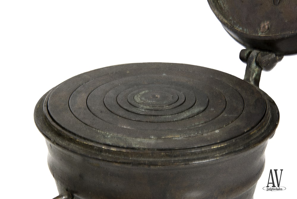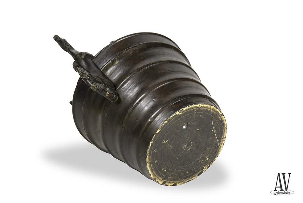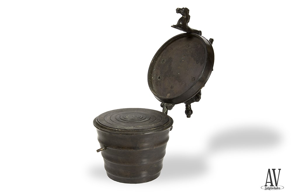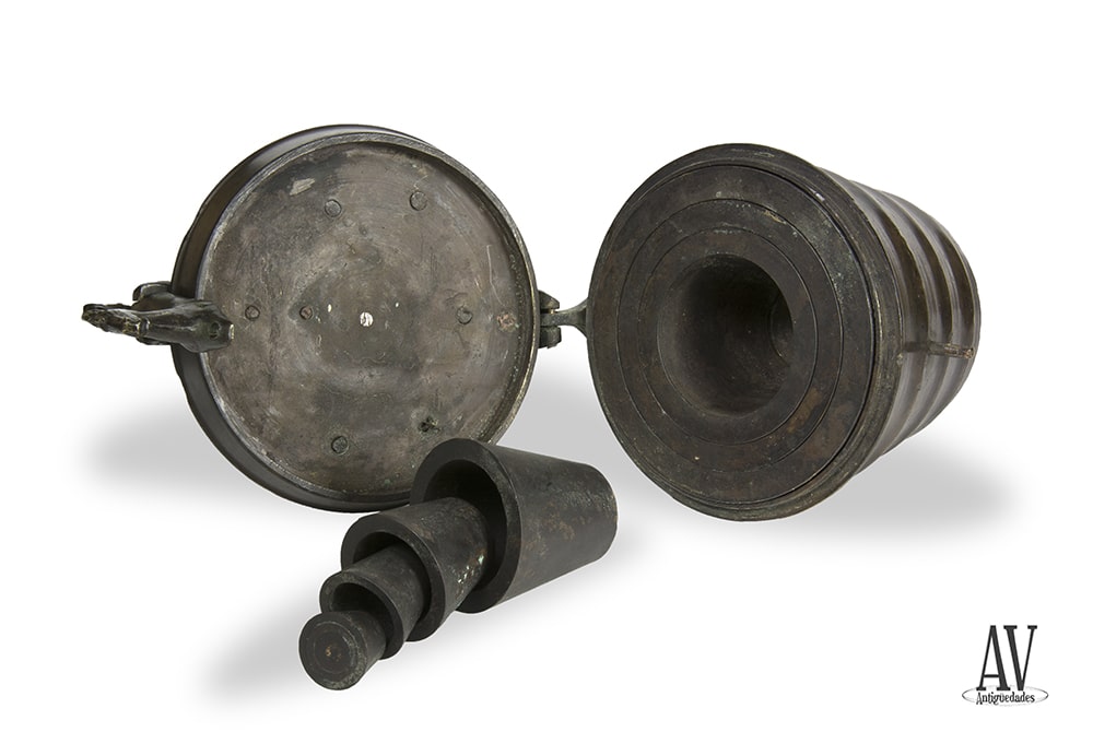 Peso ponderal de bronce con pátina oscura, negra, con las medidas de los ocho vasos interiores, también en bronce. Tapa decorada con dos elefantes en paralelo donde va agarrada el asa articulada y, caballo al frente con bisagra entre las patas para el tirador de cierre, también con la figura de caballo. Contorno del vaso con tres acanaladuras; trasera pieza remachada para articular y soportar el peso de la tapa al abrir.