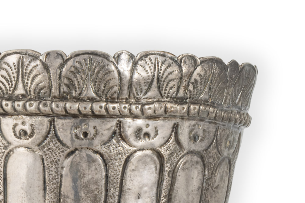 Albahaquero o macetero para contener la Albahaca en plata torneada, relevada y picada. Forma de copa con pie de cuerpo cilíndrico, borde superior de perfil curvo irregular alternando formas anchas y estrechas que corresponden a la decoración del friso superior, las figuras mayores, semiovoideas, se asemejan a hojas de acanto estilizadas; por debajo cordón apenas relevado con adornos geométricos sobre otros adornos semicirculares. El resto del cuerpo va decorado con gallones planos verticales separados por estrechas fajas punteadas que, tocan en el borde superior con los adornos semicirculares. Pie circular liso que se compone de una zona superior de perfil convexo y otra saliente plana.