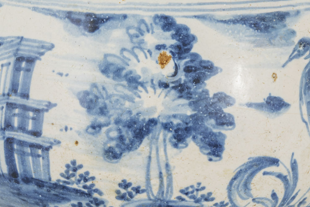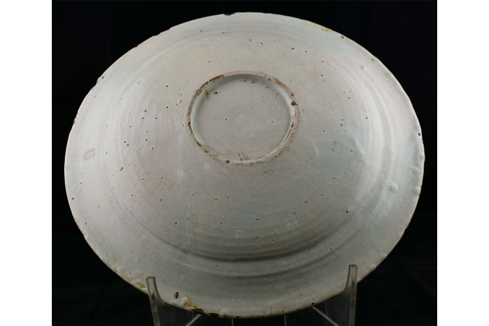 MAGNIFICO PLATO DE CERÁMICA DE TALAVERA, SERIE POLICROMA, DECORADO CON «HORROR VACUI» REPRESENTANDO UN HOMBRE A CABALLO PICANDO AL TORO EN UN PAISAJE FRANQUEADO POR DOS ARBOLES DE TRONCO GRUESO. BUEN ESTADO DE CONSERVACIÓN. TALAVERA. SIGLO XVII
