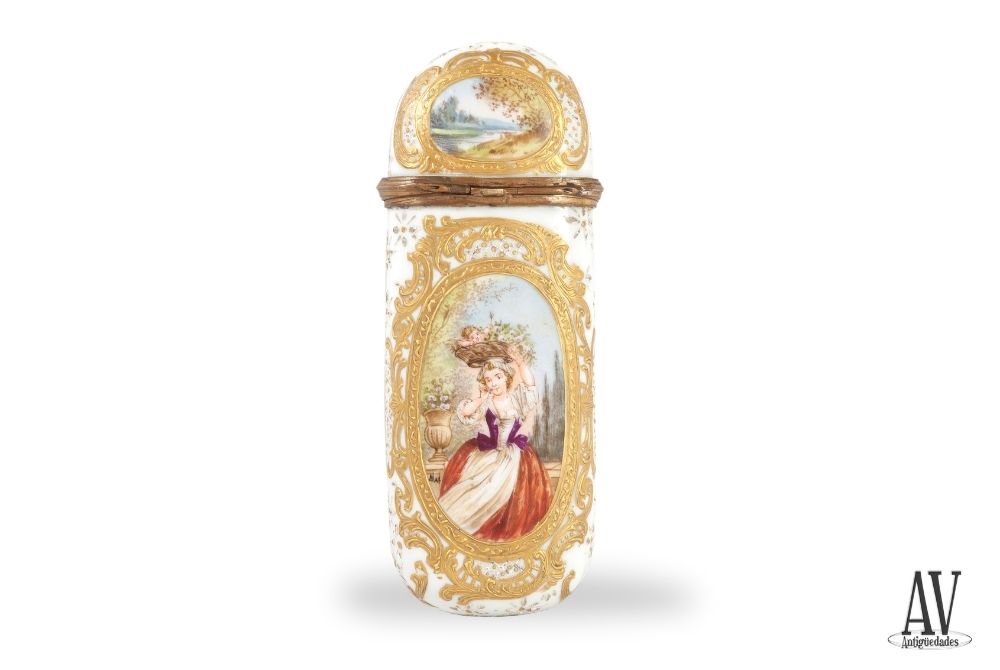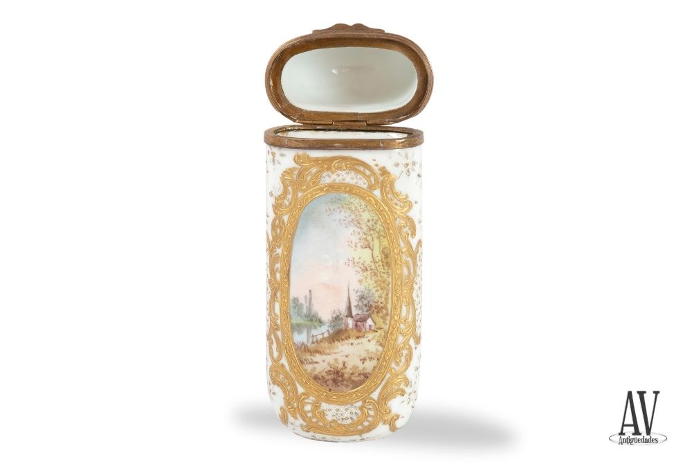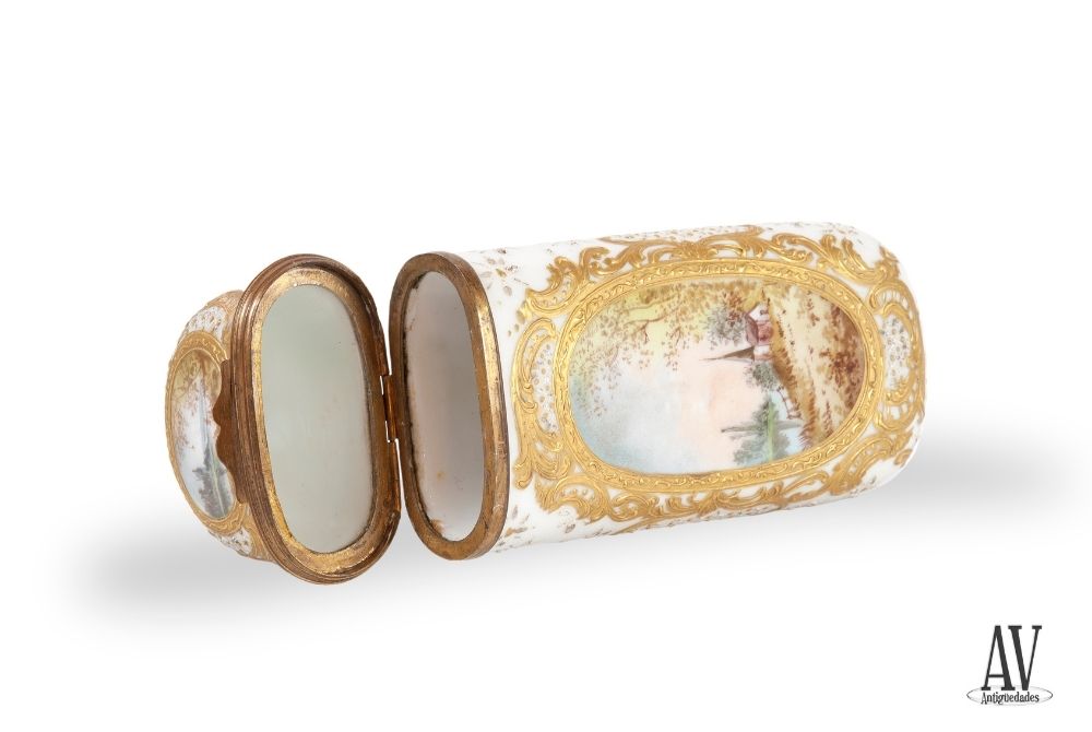 Gran Estuche «Étui» de porcelana blanca y bronce. Forma alargada y plana con extremos redondeados. Consta de dos parte cuerpo y tapa, que cierra a presión y, embocadura de bronce dorado.