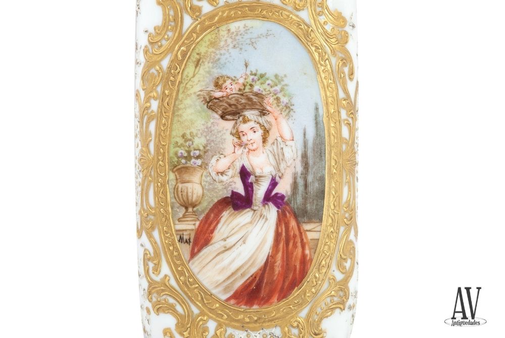 Decorado magníficamente en estilo Rococó, ofrece, centro del cuerpo con un gran óvalo en cada cara, pintado a mano, frente paisaje fluvial y, trasera dama en jardín con cesto de flores y putti sobre la cabeza; resto decoración en relieve de rocallas y tornapuntas en dorado, flores o estrellas y losanges. Tapa misma decoración con paisaje fluvial.