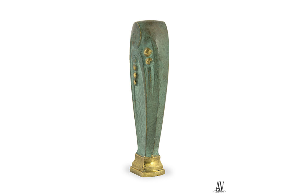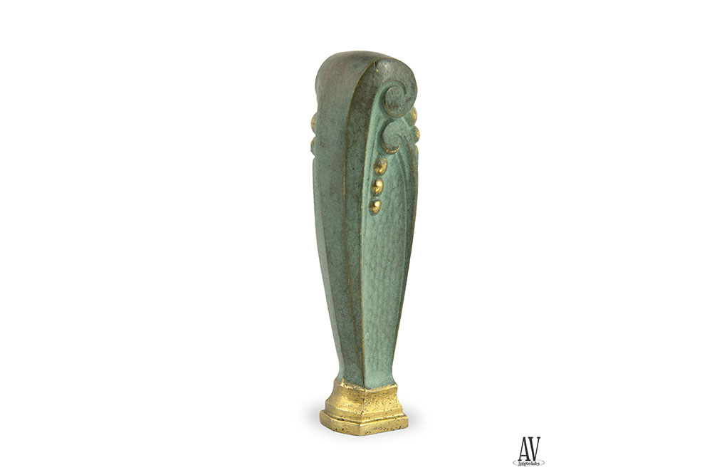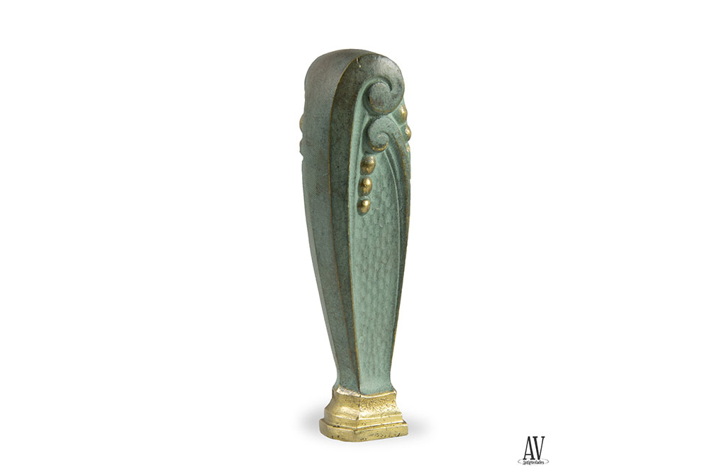 Sello realizado en bronce dorado con pátina verde, formato ovoide alargado y base escalonada dorada, decorado con formas geométricas, dos roleos de patas largas afrontados y montadas de los que cae unas perlas doradas, fondo de martele. Hacia 1920