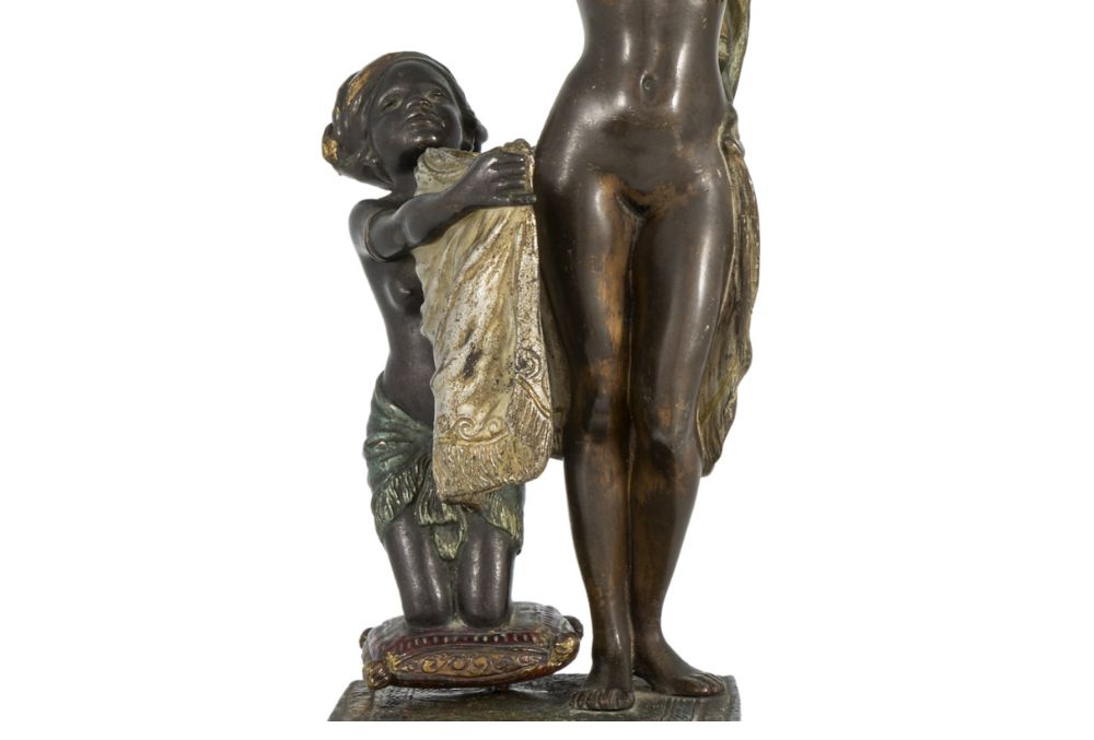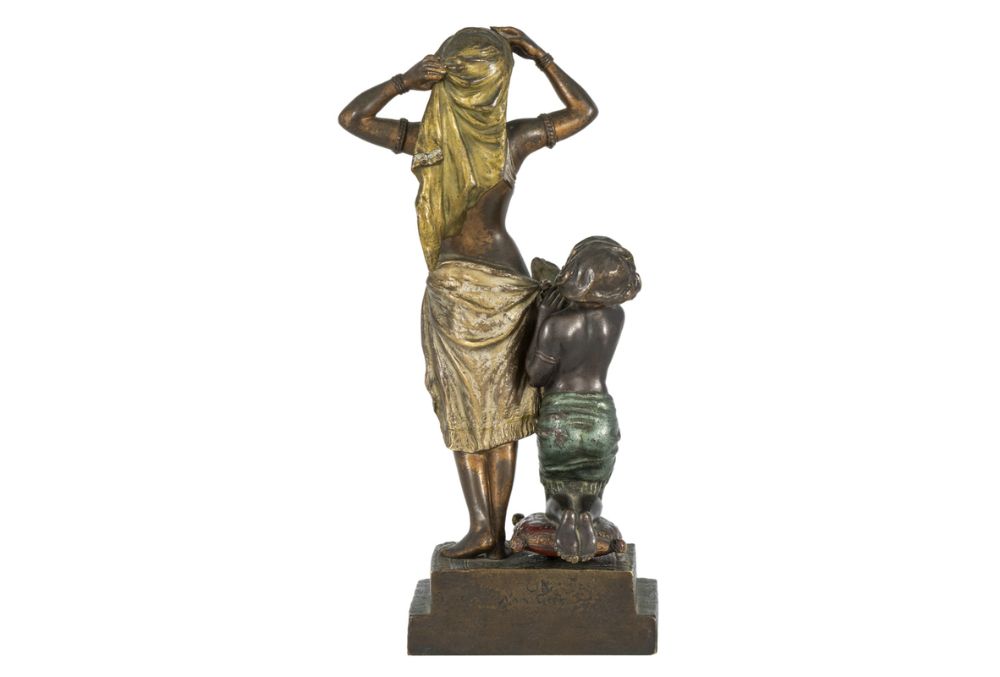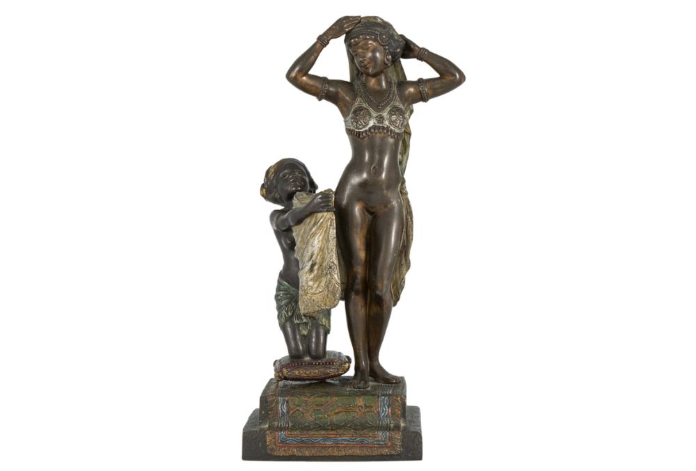 Bronce de bulto redondo, movible, Vienes o Austriaco pintado a mano y en frío, es un tipo de bronce que los denominan por su temática traviesos o eróticos, aquí representan a una princesa árabe con su esclava abriendo el vestido y, dejando ver sus partes íntimas. Firmado en la parte trasera por Bergman (Namgreb).